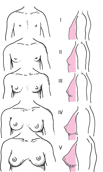T4 - 2 to 3 years - the areola now moves away from the contour of the underlying beast and rises up. When looking from the side there is a distinct sereparation of the two structures. Breast tissue continues to grow.
